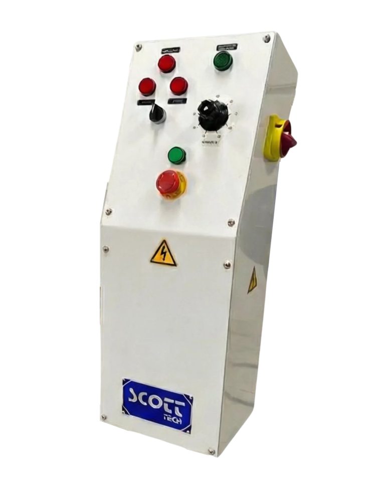 Painel de comando em aço carbono com acabamento em pintura epóxi incorporado ao equipamento.